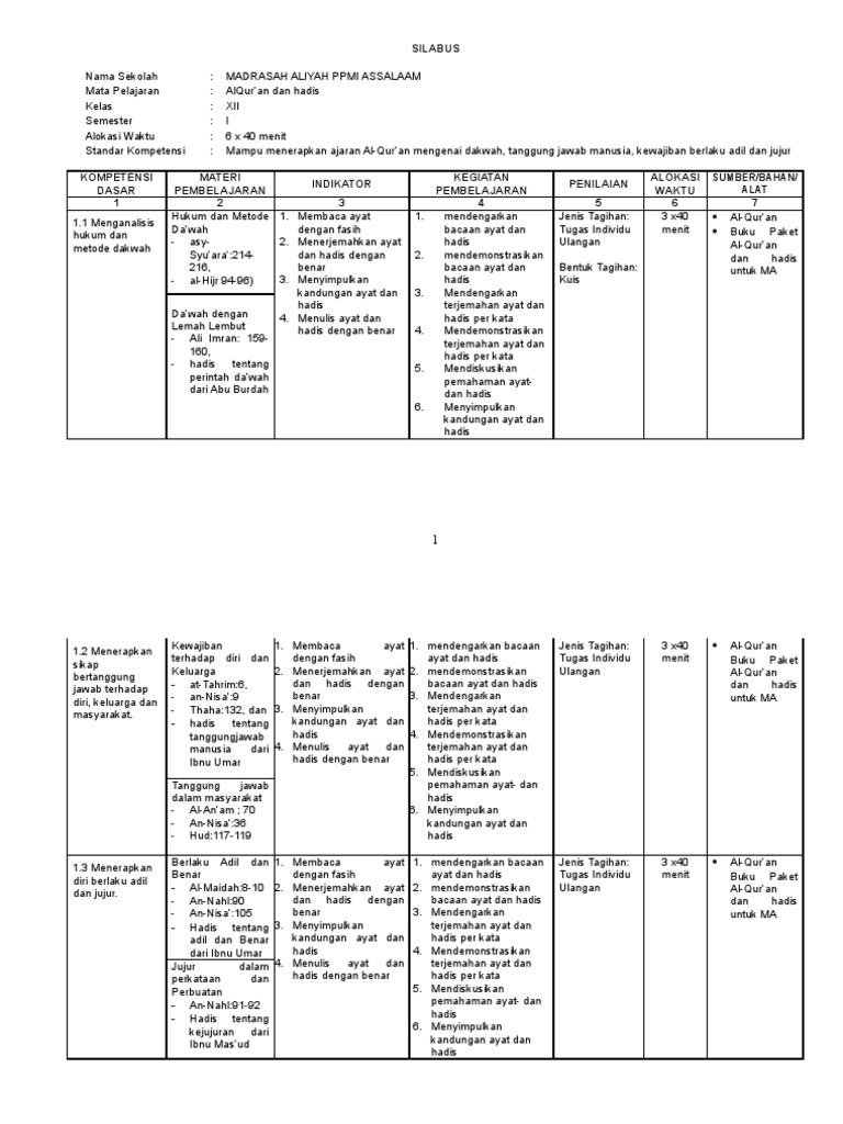Silabus pembelajaran qur'an hadist mts kelas tujuh (7/vii) kurikulum 2013 semester 1 dan 2. Silabus quran hadits ma kurikulum 2013 guru ilmu sosial. Dari sini saya sarankan untuk anda yang menginginkan file silabus quran hadits kelas 7 semester 1 dan 2 kurikulum silabus merupakan rencana pembelajaran pada suatu kelompok mata pelajaran dengan tema baca juga : Hajar dewantoro 25 november 2016 6. Vii / genap materi :